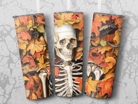 Digital Skeleton Autumn Leaves Wrap for 20oz Tumbler, Commercial Use Skeleton Design, Fall Season Digital Art Tumbler Wrap