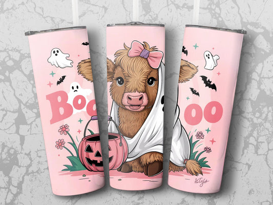 Cute Halloween Cow Tumbler Wraps, Pink Skinny Tumbler Design with Ghosts, Spooky Digital Download, 20oz Tumbler PNG, Commercial Use