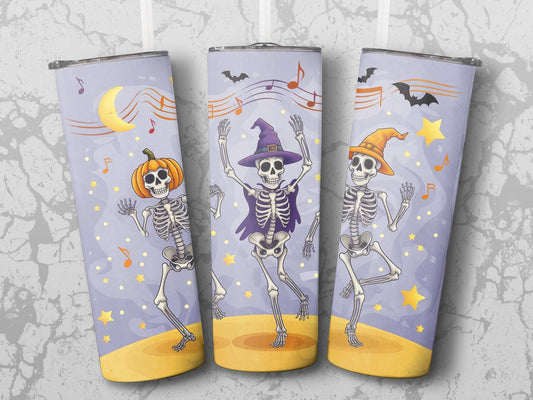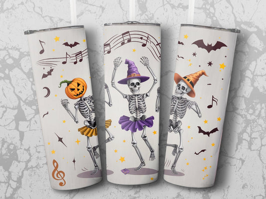 Halloween Skeleton Dance 20oz Skinny Tumbler Wraps PNG, Dancing Skeletons Tumbler Wrap Design, Commercial Use Halloween Tumbler