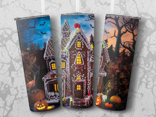 Halloween Gingerbread House Tumbler Wraps, Spooky Pumpkin Digital Download, 20oz Skinny Tumbler Wrap, Trick or Treat Scene