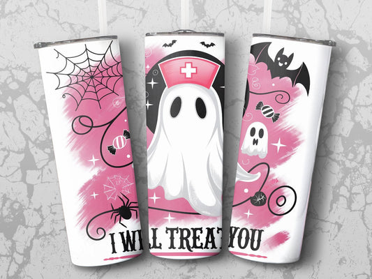 Halloween ghost nurse skinny tumbler wrap, spooky cute digital download, 20oz tumbler PNG, I will treat you design, bats and spiderwebs