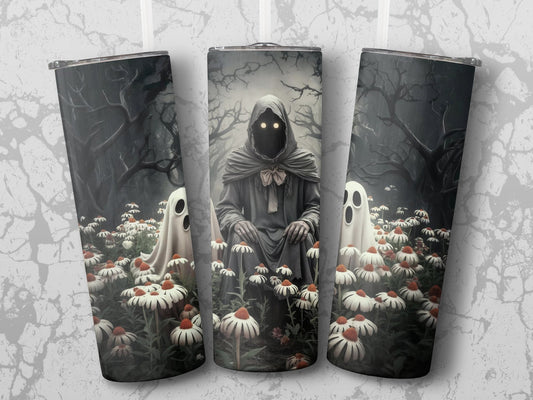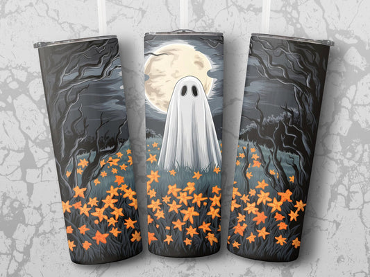 Halloween Ghost Tumbler Wrap, Spooky Night Digital Download, 20oz Skinny Tumbler PNG, Ghost in Flower Wrap, Commercial Use