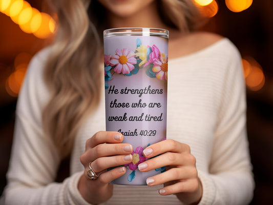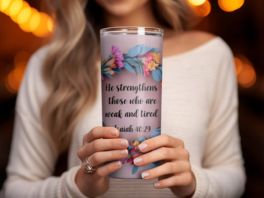 Inspirational Bible Verse Skinny Tumbler Wrap, 20oz Digital Design, He Strengthens, Commercial Use, Floral Wreath, PNG, Isaiah 40:29