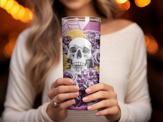 Skull and Flowers Tumbler Wrap PNG, Goth Floral Skinny Tumbler Design, 20oz Straight Tumbler, Commercial Use Download